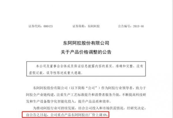 2015年11月,东阿阿胶上调东阿阿胶、复方阿胶浆、桃花姬阿胶糕出厂价15%;