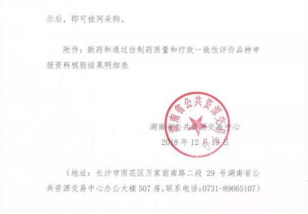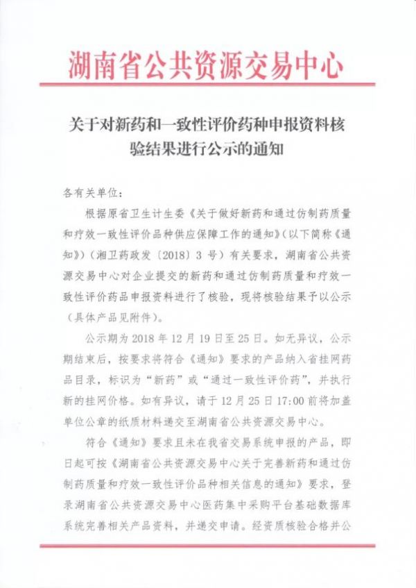 12月20日,湖南省公共资源交易中心发布关于《关于对新药和一致性评价药种申报资料核验结果进行公示的通知》(以下简称《通知》)。