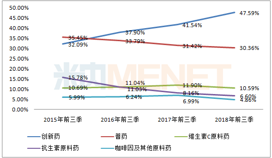 图2:2015-2018年同期石药集团各业务板块占总收入比例