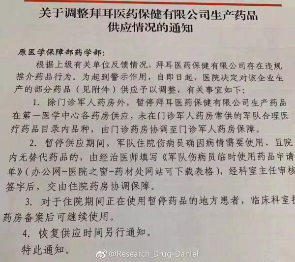 日前,某部队医院发布《关于调整拜耳医药保健有限公司生产药品供应情况的通知》,提出拜耳医药保健有限公司存在违规推介药品行为,为起到警示作用,自即日起,医院决定对拜耳生产的部分药品供应予以调整。