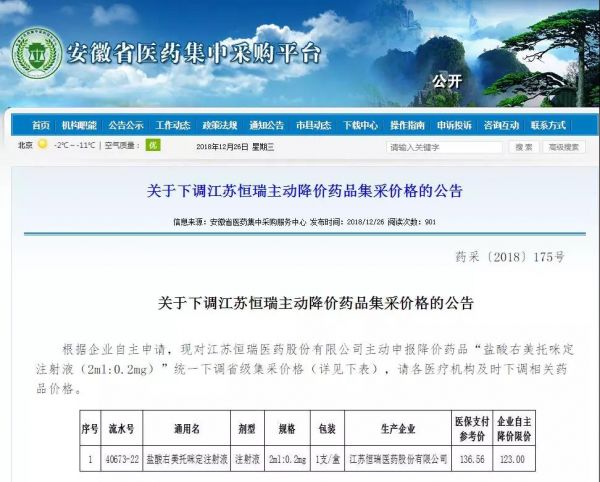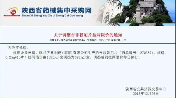 12月26日,陕西省公共资源交易中心挂出一则通知称,根据企业申请,齐鲁制药(海南)有限公司生产的吉非替尼片(规格:0.25g*10片)挂网限价由1585元/盒调整为498元/盒,调整后的挂网限价即日执行。计算下来,降幅接近68.5%。无独有偶,安徽省医药集中采购平台也发布通知称,根据企业自主申请,对江苏恒瑞医药股份有限公司主动申报降价药品“盐酸右美托咪定注射液(2ml:0.2mg)”统一下调省级集采价格——123元/支。