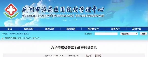 12月26日,芜湖市药品医用耗材管理中心发布《九华痔疮栓等三个品种调价公示》。