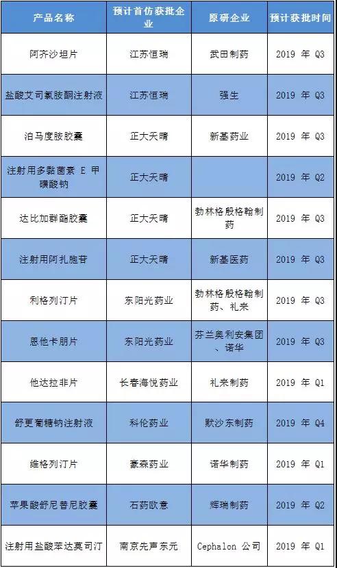 据Insight数据库筛选,恒瑞、正大天晴、东阳光药业、长春海悦、科伦药业、豪森药业、石药欧意、南京先声东元,这些企业的13个首仿药品预计会在2019年上市。如下图: