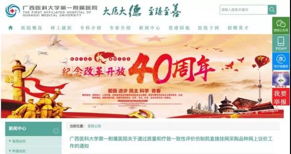 近日,广西医科大学第一附属医院发布《关于通过质量和疗效一致性评价仿制药直接挂网采购品种网上议价工作的通知》。