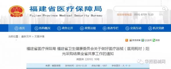 12月28日,福建省卫健委、医保局两部门联合发布《关于做好医疗器械(医用耗材)阳光采购结果全省共享工作的通知》(以下简称《通知》),从2019年1月1日起,各级医保定点公立医疗机构要在省级平台进行阳光采购。