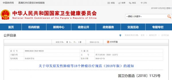 《通知》表示,为进一步提高相关肿瘤诊疗规范化水平,保障医疗质量与安全,我们组织对原发性肺癌等18个肿瘤病种诊疗规范进行了制修订,形成了相关肿瘤诊疗规范(2018年版)。