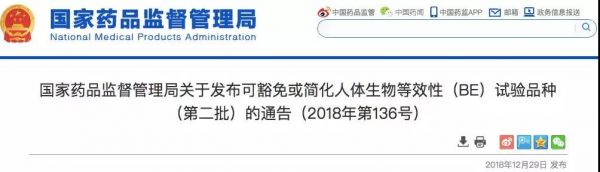 12月29日,国家药监局官网发布《国家药品监督管理局关于发布可豁免或简化人体生物等效性(BE)试验品种(第二批)的通告(2018年第136号)》,有9个品种可豁免人体BE,5个品种可申请豁免人体BE。