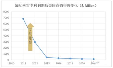 赛诺菲的波立维(硫酸氢氯吡格雷片)就是一个最典型的例子。波立维在美国的销售额从70亿美元下降到100多万美元只用了2年时间(2011-2013年)。近5年以来,波立维的销量一直都没有复苏,最高销售额没有超过200万美元,但没有停产停售。赛诺菲这么做,可能也就是保留波立维的品牌影响力而已。氯吡格雷仿制药2017年美国销售额1.3亿美元,是波立维销售额的100倍。