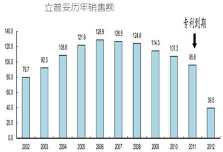 宇宙第一大药厂、医药营销之神辉瑞也不能幸免。立普妥(阿托伐他汀钙片)是辉瑞研发生产的最畅销的血脂调节处方药,保持有多个销售纪录,包括:医药史上第一个销售累计过千亿美元的处方药;2004年首个年销售突破百亿美元(108.6亿)的处方药;自2004年起连续七年销售收入过百亿美元。立普妥在2011年美国专利到期后,销售额从95.8亿美元大幅下降,头顶辉瑞品牌的光环,2017年销售额仍有19.2亿美元,但也仅为巅峰时期的1/6。