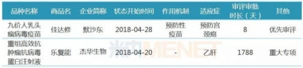 九价人乳头瘤病毒疫苗(简称九价HPV疫苗,商品名佳达修)适用于16至26岁女性、三剂免疫接种程序预防宫颈癌,该产品分别于2014年、2015年在美国和欧盟获批。4月23日,九价HPV疫苗以“具有明显临床优势”为由纳入优先审评,从CDE承办到获批上市仅历时8天,堪称火箭速度。5月11日,默沙东在海南进行挂网价格谈判,谈判价格为1298元/支。
