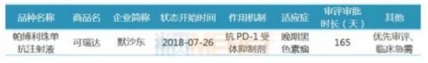 帕博利珠单抗注射液(商品名可瑞达)是国内唯一获批用于治疗晚期黑色素瘤的PD-1受体药物,原研厂家默沙东于2月11日提交CDE申请,11月7日以“具有明显治疗优势创新药”为由纳入优先审评,从CDE承办到获批上市仅用了短短五个多月,创下中国进口抗肿瘤生物制剂最快审评审批记录。帕博利珠单抗已在美国先后获得14个FDA授予的突破性药物审批资格,获批多达12个适应证,覆盖9种不同的晚期肿瘤,是目前获批适应证覆盖瘤种最广泛的PD-1单抗。