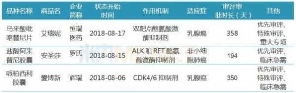 罗氏研发的盐酸阿来替尼胶囊(商品名安圣莎)可用于治疗间变性淋巴瘤激酶(ALK)阳性的局部晚期或转移性非小细胞肺癌(NSCLC)。该产品于3月28日以“具有明显治疗优势创新药”为由纳入优先审评,从CDE承办到获批上市仅历时194天。