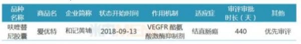 呋喹替尼胶囊(商品名爱优特)可用于治疗转移性结直肠癌,该产品由礼来与和记黄埔合作开发,是首个在中国发现、开发并获批上市的药品,也是境内外均未上市的创新药,于2017年9月4日以“具有明显临床价值”为由纳入优先审评。