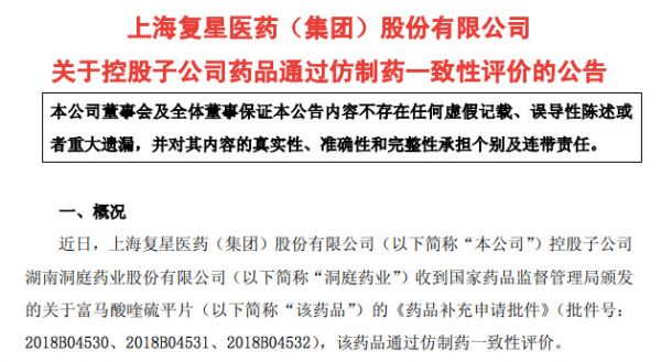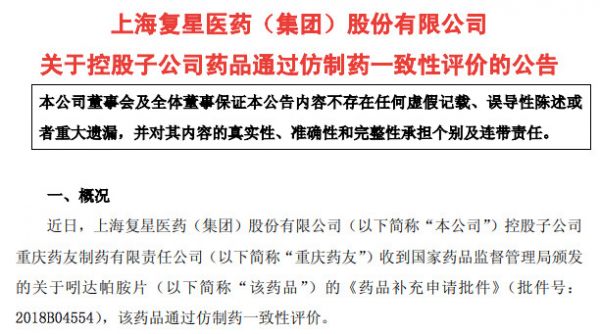 复星医药,3品种首家过一致性评价