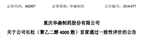 2018年12月28日,华森制药发布公告,公司的聚乙二醇4000散(规格:10g)通过一致性评价。华森制药是该品种第一家通过一致性评价的企业。