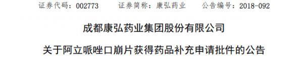 2018年12月27日,康弘药业发布公告,公司的阿立哌唑口崩片(规格:5mg、10mg)通过仿制药质量和疗效的一致性评价。