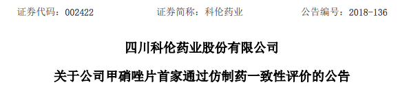 2018年12月27日,科伦药业发布公告,公司近日获得国家药品监督管理局核准签发的化学药品甲硝唑片(规格:0.2g)的《药品补充申请批件》,为该品种首家通过仿制药一致性评价。