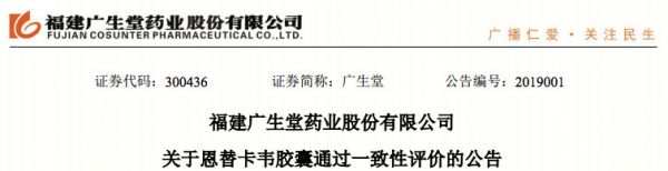 甲硝唑是全球上市的第一个硝基咪唑类抗生素,临床应用超过50年,疗效确切,安全性好。《临床诊疗指南—传染病学分册》、《抗菌药物临床应用指南(2015年版)》等国内权威指南推荐甲硝唑为阿米巴病的首选药物,为多种厌氧菌和原虫感染的一线用药。甲硝唑片已进入国家甲类医保和2018年国家基药目录。 公告显示,截至目前,公司在甲硝唑片一致性评价项目上已投入研发费用约667万元人民币。 ▍恩替卡韦,又一家过评 1月3日,广生堂发布公告,公司的恩替卡韦胶囊(规格:0.5mg)通过仿制药质量与疗效一致性评价。广生堂也是该品种第四家通过一致性评价的企业。