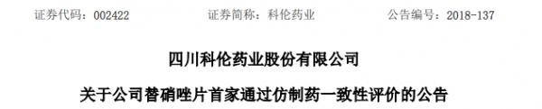 2018年12月28日,科伦药业发布公告,公司近日获得国家药品监督管理局核准签发的化学药品替硝唑片(规格:0.5g)的《药品补充申请批件》,为该品种首家通过仿制药一致性评价。