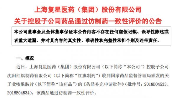 2018年12月29日,复星医药发布公告,其控股子公司沈阳红旗制药有限公司的吡嗪酰胺片(规格:0.25g、0.5g)通过仿制药一致性评价。公司为该品种首家通过一致性评价的企业。