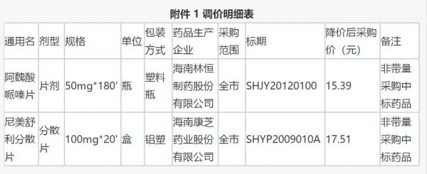 第二批集中带量采购结果公布后,海南林恒制药股份有限公司、海南康芝药业股份有限公司2家生产企业在规定的时间内提交了申请,自愿将中标价下调到不高于带量采购中标价格。
