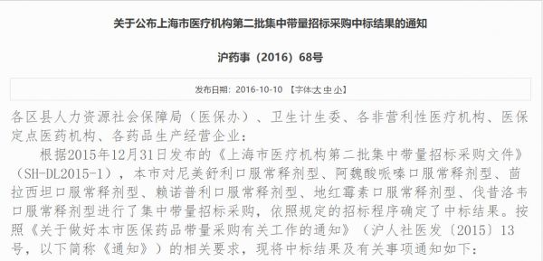 根据上海市药事所于 2016年 10 月 10日发布的《关于公布上海市医疗机构第二批集中带量招标采购中标结果的通知》(以下简称《通知》)。
