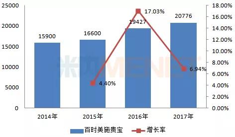 图1:2014-2017年百时美施贵宝销售业绩(单位:百万美元)