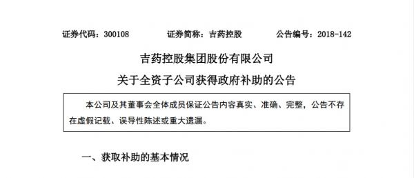 12月28日,吉药控股发布公告,吉药控股全资子公司金宝药业于近日收到政府扶持企业发展资金人民币 3168 万元。