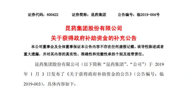 1月5日,昆药集团发布公告称,昆药集团于2019年1月3日发布了《关于获得政府补助资金的公告》。