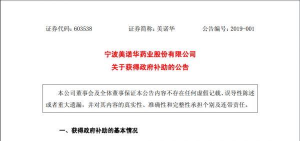 1月3日,美诺华发布公告称,2017年4月27日至2018年12月29日期间,宁波美诺华及下属子公司浙江美诺华、宣城美诺华、燎原药业、安徽美诺华等累计收到与收益相关的政府补助共计人民币 4525900.97元,占公司最近一期审计净利润的10.13%。