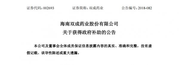 12月25日,海南双成药业发布公告称,根据《海口市人民政府关于印发海口市加快工业发展若干规定的通知》的有关规定, 海南双成药业2018 年向海口市科学技术工业信息化局申报了专业技术人才补贴和医药生产企业国际认证奖励。