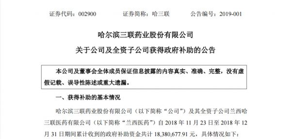 1月2日,哈尔滨三联药业发布公告称,哈尔滨三联药业及其全资子公司兰西哈 三联医药自2018年11月23日至2018年12月31日期间累计收到的政府补助资金共计1838677.91 元。