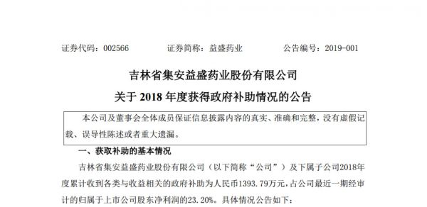1月1日,集安益盛药业发布公告称,吉林省集安益盛药业及下属子公司2018年度累计收到各类与收益相关的政府补助为人民币1393.79万元,占公司最近一期经审计的归属于上市公司股东净利润的23.20%。