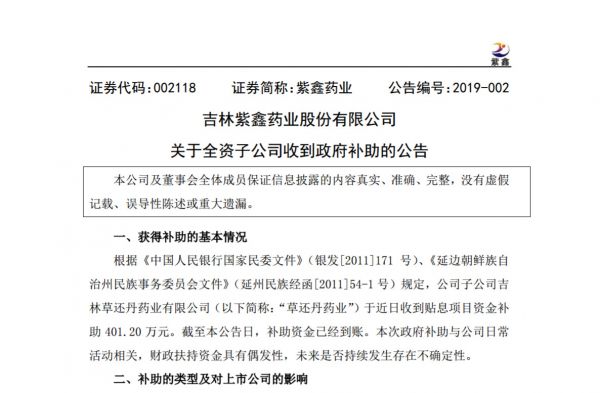 1月4日,吉林紫鑫药业发布公告称,根据《中国人民银行国家民委文件》、《延边朝鲜族自治州民族事务委员会文件》规定,公司子公司草还丹药业于近日收到贴息项目资金补助401.20万元。