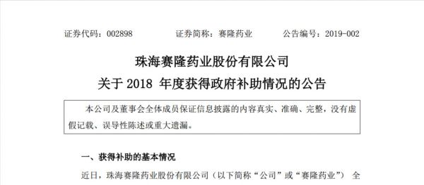 1月5日,赛隆药业发布公告称,近日,赛隆药业全资子公司湖南赛隆药业收到两笔华容县政府技术扶持资金,金额合计为7618400 元,占公司2017年度经审计的归属于上市公司股东净利润的11.81%。