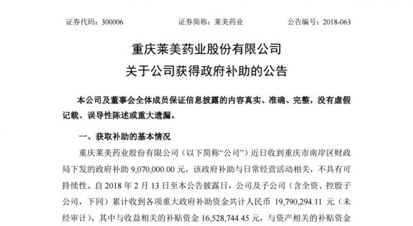 12月28日,重庆莱美药业发布公告,重庆莱美药业近日收到重庆市南岸区财政 局下发的政府补助9070000.00 元,该政府补助与日常经营活动相关,不具有可持续性。