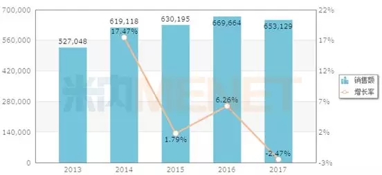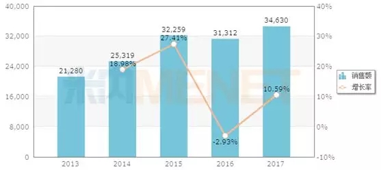盐酸替罗非班氯化钠注射液是一种心血管疾病药物,用于对非ST段抬高型急性冠状动脉综合症(NSTE-ACS)患者的治疗。据米内网数据显示,2017年替罗非班注射剂在中国公立医疗机构终端销售额3.46亿元,同比增长10.59%。