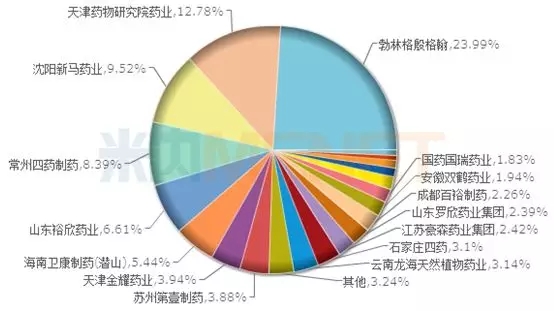在TOP20品牌中,勃林格殷格翰、天津药物研究院药业、沈阳新马药业、常州四药制药和山东裕欣药业前五家生产企业,合计占据了超过60%的市场份额。其中,首位的勃林格殷格翰销售额超过15亿元。