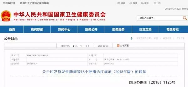 注:2018年12月21日,国家卫健委下发《关于印发原发性肺癌等18个肿瘤诊疗规范(2018年版)的通知》国卫办医函〔2018〕1125号