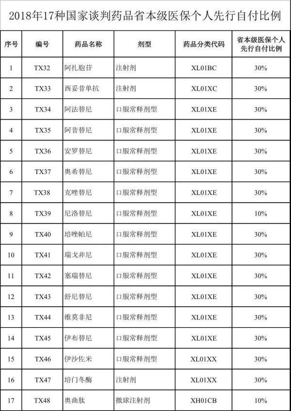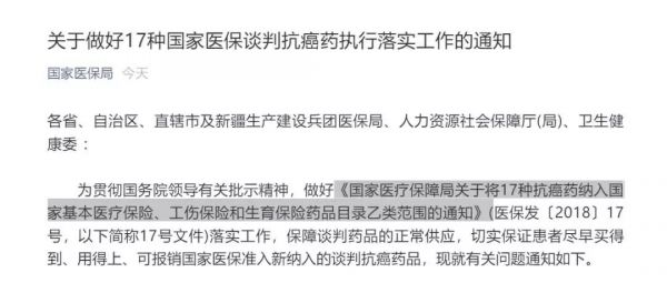 注:2018年11月29日,国家医保局办公室已经联合人社部办公厅、国家卫健委办公厅联合发布《关于做好17种国家医保谈判抗癌药执行落实工作的通知》(以下简称通知)。