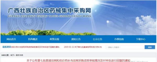 、近日,广西壮族自治区药械集中采购网发布文件《关于第七批直接挂网和低价药补充挂网采购资质审核情况及对申诉进行回复的通知》。