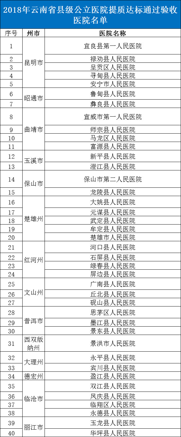 2018年12月27日,云南省卫健委发布《2018年云南省第二批县级公立医院提质达标验收评审结果的公示》,确定了40所县医院为第二批县级公立医院提质达标通过验收的医院。