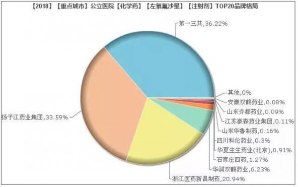 其中,据药春秋数据,2018年重点城市公立医院的左氧氟沙星注射剂市场份额前20名中,市场份额前三的药企分别为第一三共,扬子江和浙江医药新昌制药,分别为36.22%,33.59%和20.94%,四川科伦仅为0.3%。