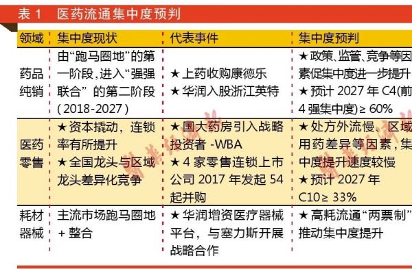 医药流通的强马太效应(强者愈强、弱者愈弱)决定了外延并购是企业发展壮大的核心手段之一。我国医药流通前四强仅占到行业38%的收入,与美国、日本同行存在很大的差距,未来仍有较大的提升空间。笔者对行业集中度的预判如表1。
