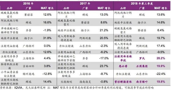 表1:IQVIA中国医院市场前十用药及MAT增长情况(2016A~2018Q3)