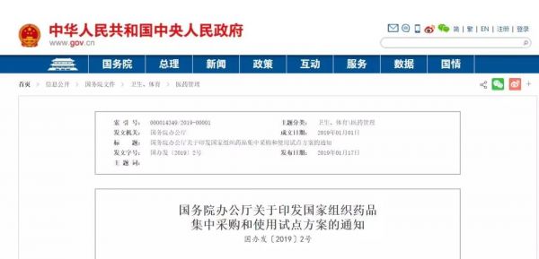 1月17日,国务院办公厅正式发布了《国家组织药品集中采购和使用试点方案的通知》国办发〔2019〕2号。