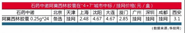 根据统计可知:石药中诺的阿莫西林胶囊(0.25g*24粒)在试点城市最低中标价为上海市,为2.48元/盒。若按谈判要求最低降幅10%则为2.23元/盒,即0.093元/粒。