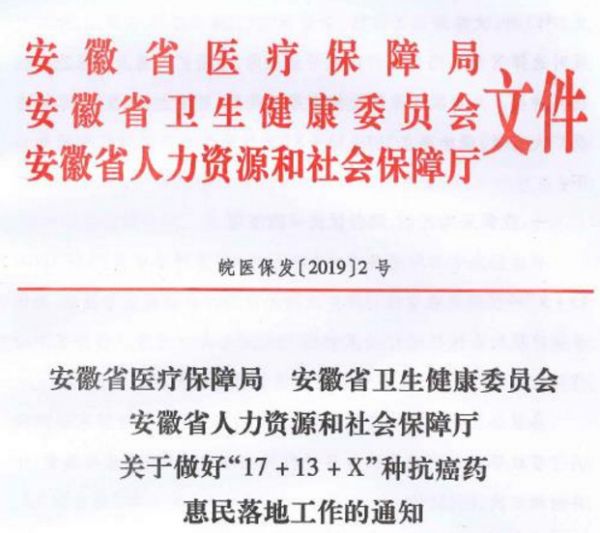 日前,安徽省医保局、省卫健委、省人社厅联合发布《关于做好“17+13+X”种抗癌药惠民落地工作的通知》(以下简称《通知》)。