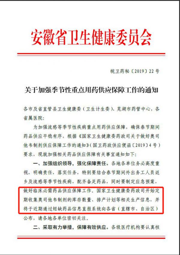 据悉,近期,国家卫健委发布《国家卫生健康委药政司关于做好奥司他韦制剂供应保障工作的通知》(国卫药政供应便函[2019]4号),摸底奥司他韦制剂的库存情况。