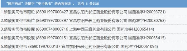 据查询国家药品监督管理局网站,奥司他韦除罗氏制药的“达菲”外,还有5个国产批文,分别为深圳市东阳光实业发展有限公司下属宜昌东阳光长江药业股份有限公司和上海中西三维药业有限公司生产的“磷酸奥司他韦胶囊/颗粒”。